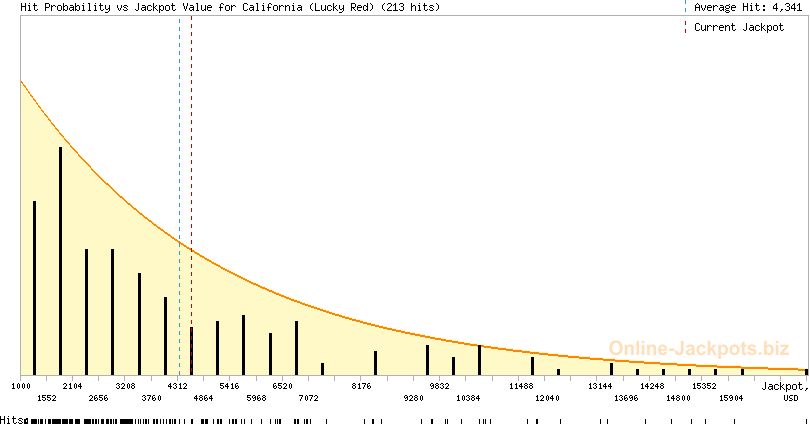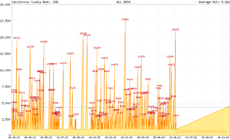 California (Lucky Red) is a pooled progressive jackpot that is hit randomly. The jackpot can be won at random, on any paid spin. To increase your chances of winning the California jackpot you need to increase your wagers and play more time, providing the jackpot is big enough to deliver you the best odds.