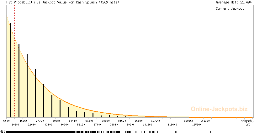 Cash Splash progressive slot has paid out $545,344.78 to a total of 27 online jackpot winners in August 2005 alone and continues to pay 100's of thousands dollars to dozens of winners each month. The average jackpot hit is about $30,000. You can see selected stories and testimonials of over 180 Cash Splash winners with their photos and comments.
