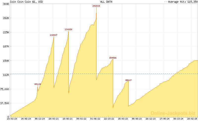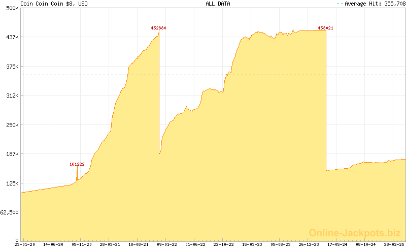 | Last Hits: | $647,962 on 2022-02-07 (Coin Coin Coin $88) $453,021 on 2024-03-24 (Coin Coin Coin $8) $95,617 on 2023-05-12 (Coin Coin Coin $1) $42,885 on 2024-12-30 (Coin Coin Coin 40c) $6,742 on 2025-03-11 (Coin Coin Coin 20c) $229 on 2025-03-16 (Coin Coin Coin 8c) |