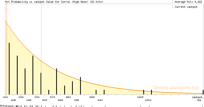 Corral (High Noon) is a shared progressive jackpot that is hit randomly. It can be won at random, on any paid spin. However, the bigger your bets the higher chances of winning the Corral jackpot you have, providing the pot has grown enough to ensure the most attractive odds for you.