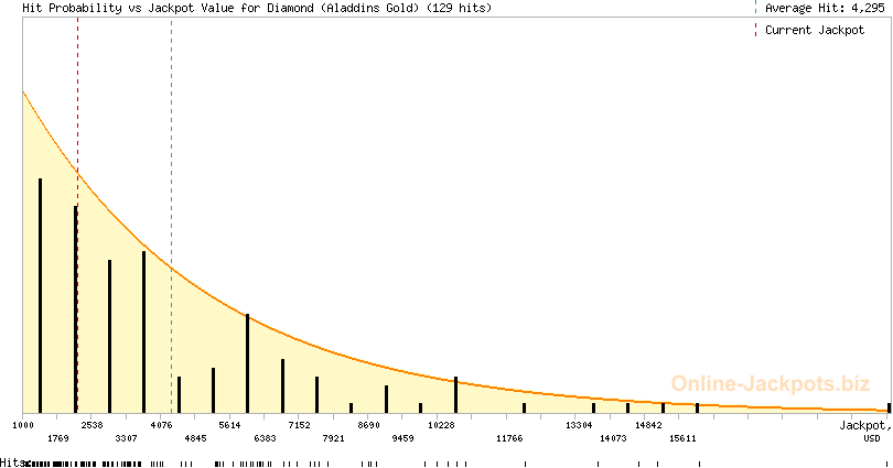 Diamond (Aladdins Gold) is a pooled progressive jackpot that is hit randomly. The jackpot can be won at random, on any paid spin. To increase your chances of winning the Diamond jackpot you need to increase your wagers and play more time, providing the jackpot is big enough to deliver you the best odds.