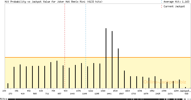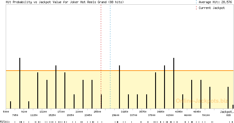 | Average Hits: | $28,576.66 (Joker Hot Reels Grand) (88 hits) $1,163.76 (Joker Hot Reels Mini) (4133 hits) |