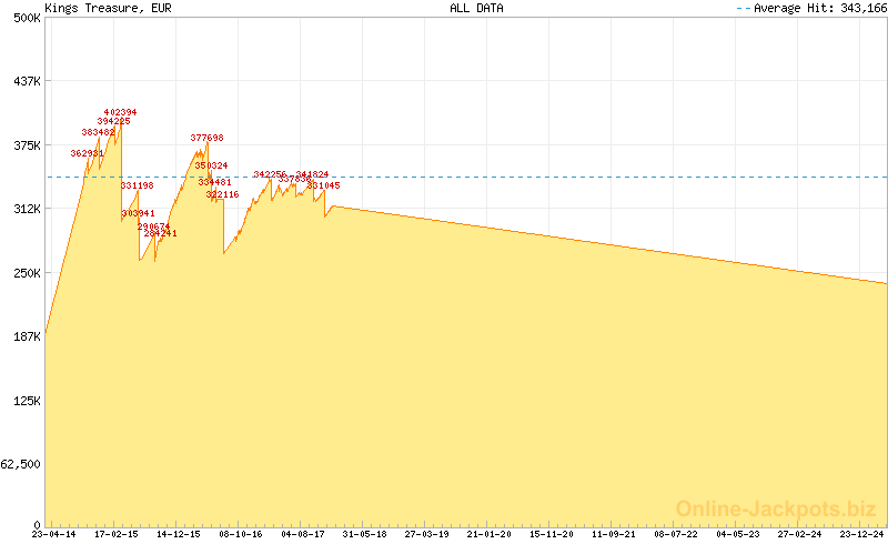 5x KING symbols trigger the Progressive Jackpot. Each stake has it's own Progressive Jackpot. The above jackpot corresponds to the max bet of €100 a spin. The Progressive Jackpot starts at 20,0000 x line bet. With a maximum bet of €100 per spin the minimum jackpot will be €100,000. So that the jackpot seed is 1,000x your total bet per spin.