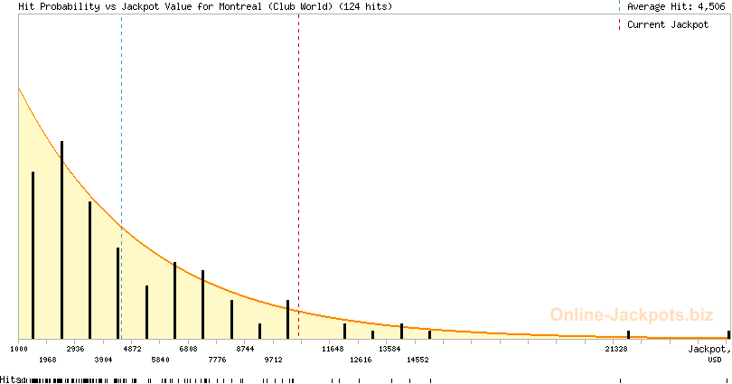 Montreal (Club World) is a pooled progressive jackpot that is hit randomly. The jackpot can be won at random, on any paid spin. To increase your chances of winning the Montreal jackpot you need to increase your wagers and play more time, providing the jackpot is big enough to deliver you the best odds.