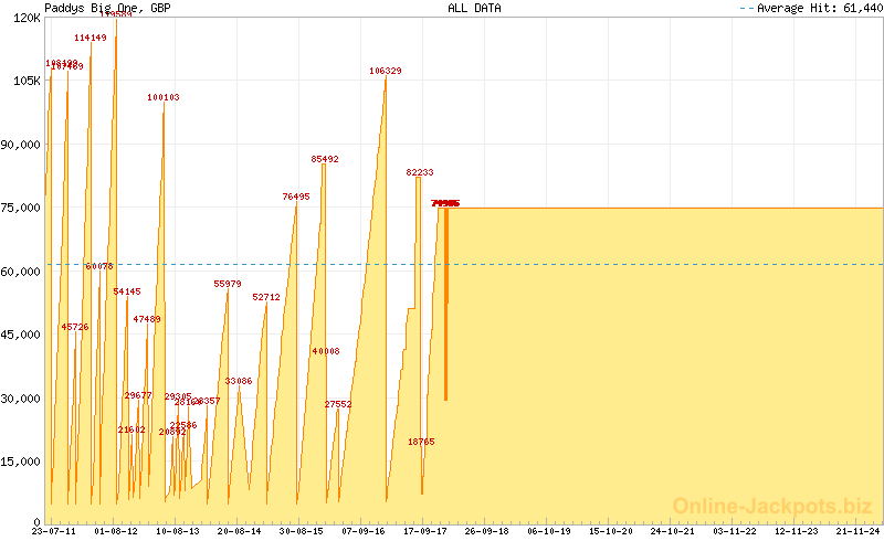 The jackpot is initially funded at £5,000 and each day it increases based on stakes for the previous day. Stakes from other networked Bingo Rooms will contribute to the same pot which has the same chance of being won on all networked Bingo Rooms. Right now this jackpot can be hit on the Paddy's Big One (Gold Room) at random.