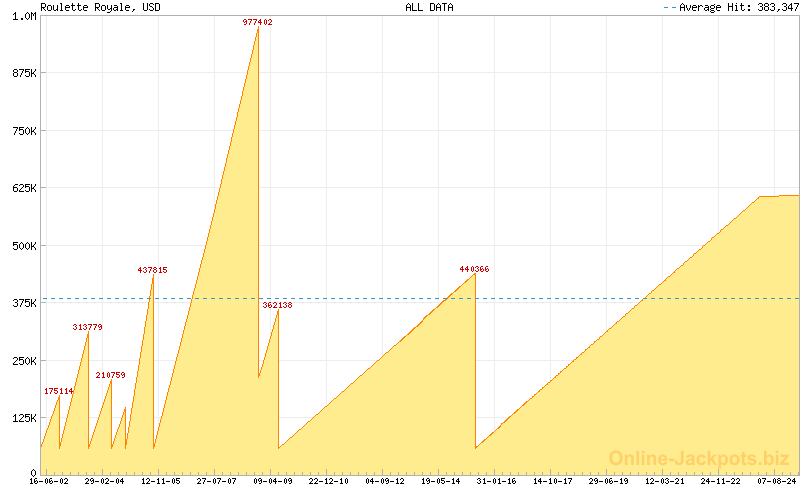 The largest ever won progressive jackpot on Roulette Royale is $437,815.15 in US Dollars or €362,139.29 in Euro - the first jackpot was hit by Steven K. at Vegas Villa online casino on September 5, 2005, the second one in June 2009 by Anja B. at Casino Action. See all Roulette Royal winners here, learn more about real progressive roulette winners and find their photos, comments and interviews.